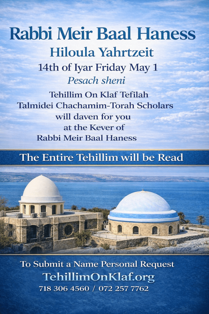 Talmidei Chachamim will daven for you at the Kever of Rabbi Meir Baal Haness on the Yahrtzeit-Hiloula